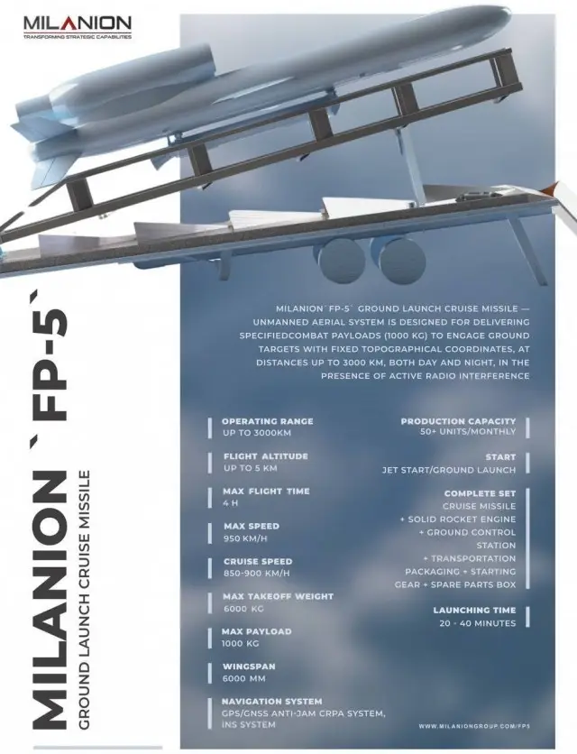 Вся шумиха началась в феврале 2025 года, когда на выставке в том же Дубае Milanion Group представила макет своей разработки FP-5. Цифры в данных впечатляли: 3 000 км дальность, скорость полета 750 км/ч крейсерская и 900 км/ч максимальная. Управление по GPS. Старт с пусковой рамы на прицепе, который можно буксировать чем угодно. Вес ракеты в снаряженном состоянии 6 000 кг.