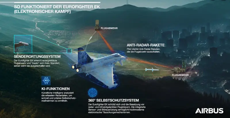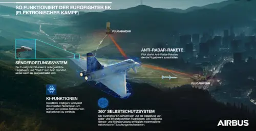Параллельно Airbus заявляет, что добавит новые возможности радиоэлектронной борьбы, интегрировав комплекс датчиков Saab Arexis в существующие и новые самолёты. Эта модификация, хотя и не была упомянута отдельно, является частью конфигурации Eurofighter EK (Electronic Combat).