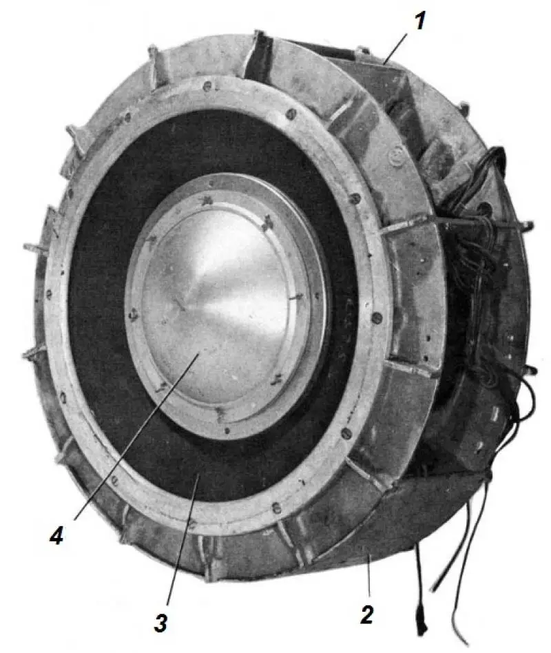 Магнитный неконтактный взрыватель донных мин Германии LMA, LMB. 1 - алюминиевая рама; 2 - батарея; 3 - резиновая диафрагма; 4 - карданный подвес с аппаратурой магнитного взрывателя
