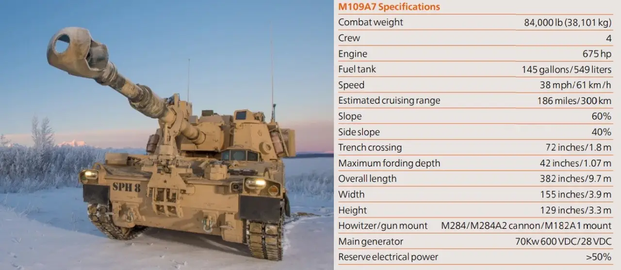 Концерн BAE Systems представил новый образец самоходной гаубицы M109A7, в первую очередь отличающийся более грозным орудием с длиной ствола 52 калибра вместо прежних 39-ти у базовой версии, к виду которой с 2022 года приводятся M109A6 Paladin американской армии.