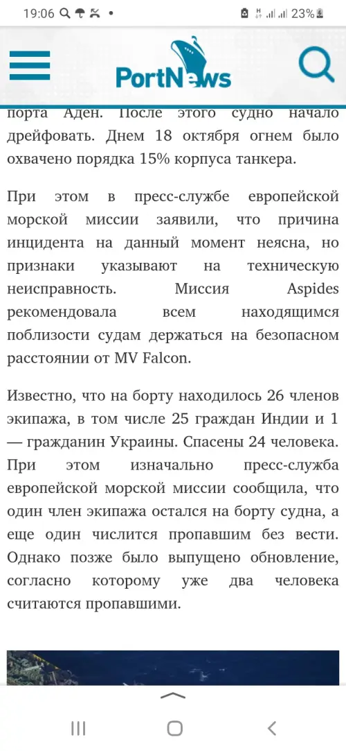Перевозящий сжиженный газ танкер MV Falcon был поражен неизвестным снарядом в Аденском заливе примерно в 113 морских милях к юго-востоку от йеменского порта Аден. Из-за вспыхнувшего на борту пожара экипаж покинул дрейфующее судно. Такую информацию предоставило Управление морских торговых операций Великобритании (UKMTO).