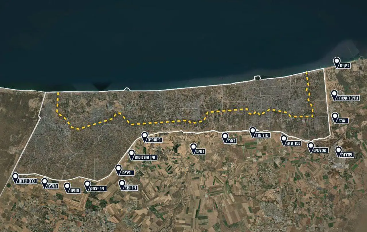 Если взглянуть на карту, то так называемая жёлтая линия делит сектор Газа на две близких по площади части. При этом большая часть, а это около 53%, де-факто превращается в новую территорию Израиля, хотя де-юре это нигде не прописано, включая то самое «соглашение о мире», которое бурным восторгом в мире было встречено после его предложения Вашингтоном.