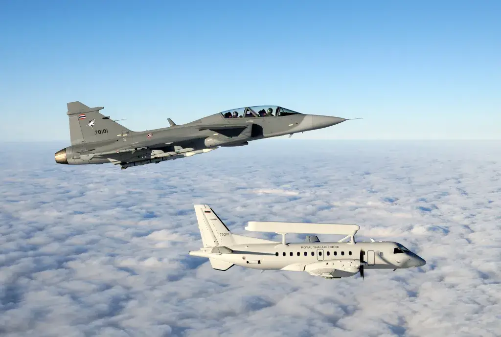 Истребитель Gripen D Королевских ВВС Таиланда и радиолокационный самолёт Saab 340 Erieye.