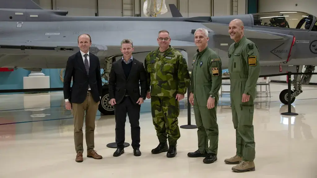 Микаэль Гранхольм из FMV, министр обороны Пол Йонсон, главнокомандующий Вооружёнными силами Швеции Микаэль Классон, командующий ВВС Швеции Йонас Викман и командир эскадрильи «Скараборг» Маттиас Оттис