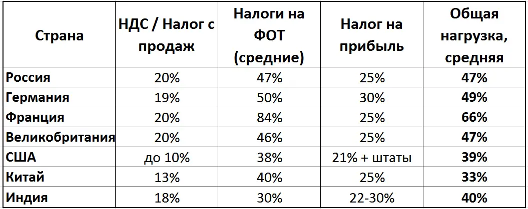 Ставки НДС в Китае, Индии, США, Японии и Южной Корее намного ниже, чем в России. По ставкам НДС Россия близка к тому, чтобы сравняться с Италией и Словенией (у них тоже 22%). Самый высокий НДС у Венгрии – целых 27%. Однако общая налоговая нагрузка в Венгрии ниже, чем в России, поскольку там ниже корпоративный налог и налоги на фонд оплаты труда (ФОТ).