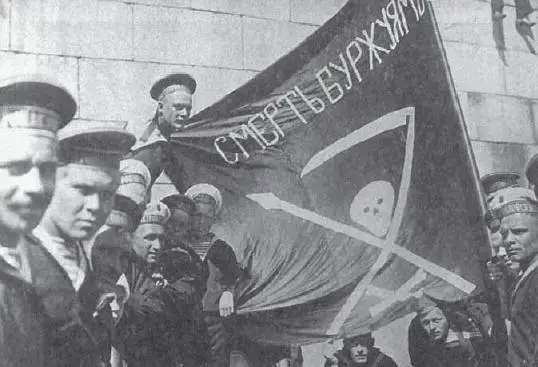 Революционные матросы линкора «Петропавловск» (Балтийский флот) в Гельсингфорсе (ныне Хельсинки) вокруг красного знамени, на котором написано «Смерть буржуямъ!»