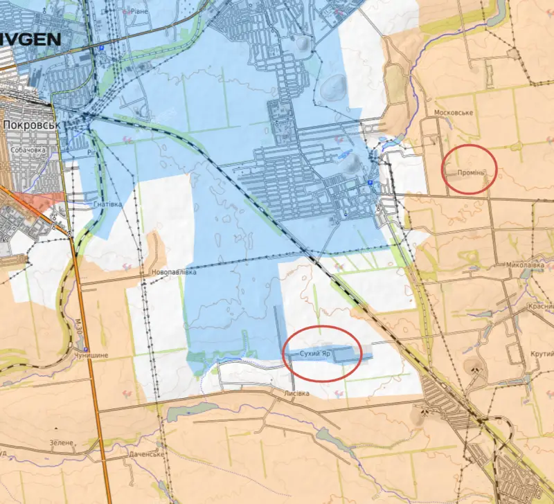 Освобождение села Проминь позволяет нашей армии начать блокирование остатков гарнизона противника в населенном пункте Сухой Яр к югу от Покровска (Красноармейска).