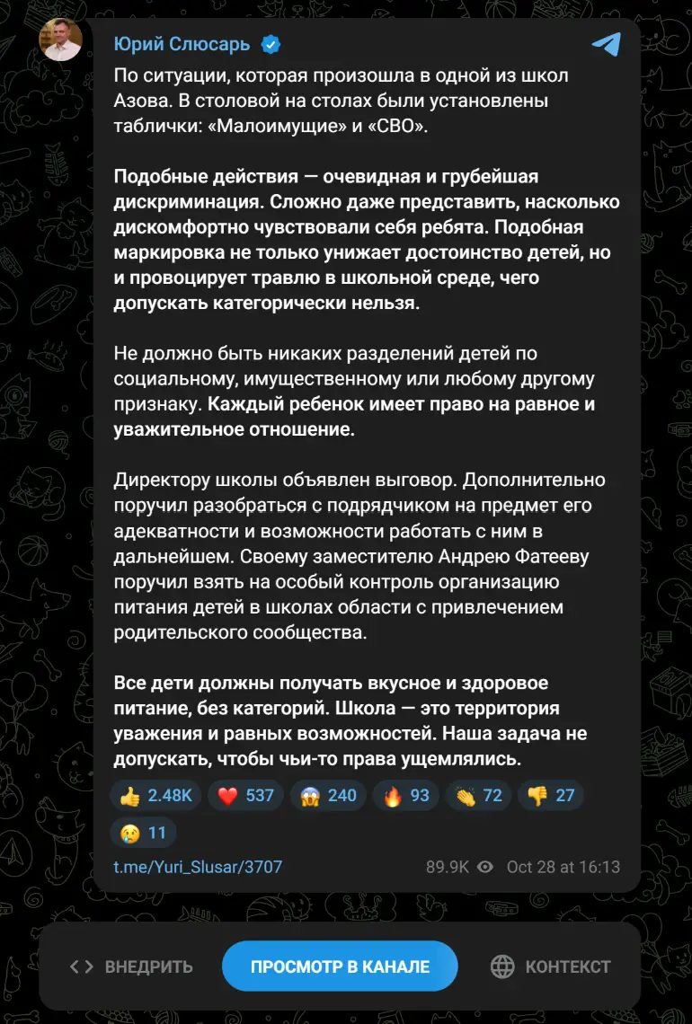 В одной из школ города Азов Ростовской области администрация делила детей на «малоимущих» и «СВО». В школьной столовой были установлены соответствующие таблички. Школьников из разных категорий рассаживали за разными столами. Кроме того, как заметили пользователи сети, на столе для «малоимущих» еда была гораздо менее питательной, чем на остальных — тогда как школьников, отнесенных к категории «СВО», кормили пюре и мясом, «малоимущим» предлагали только манную кашу.