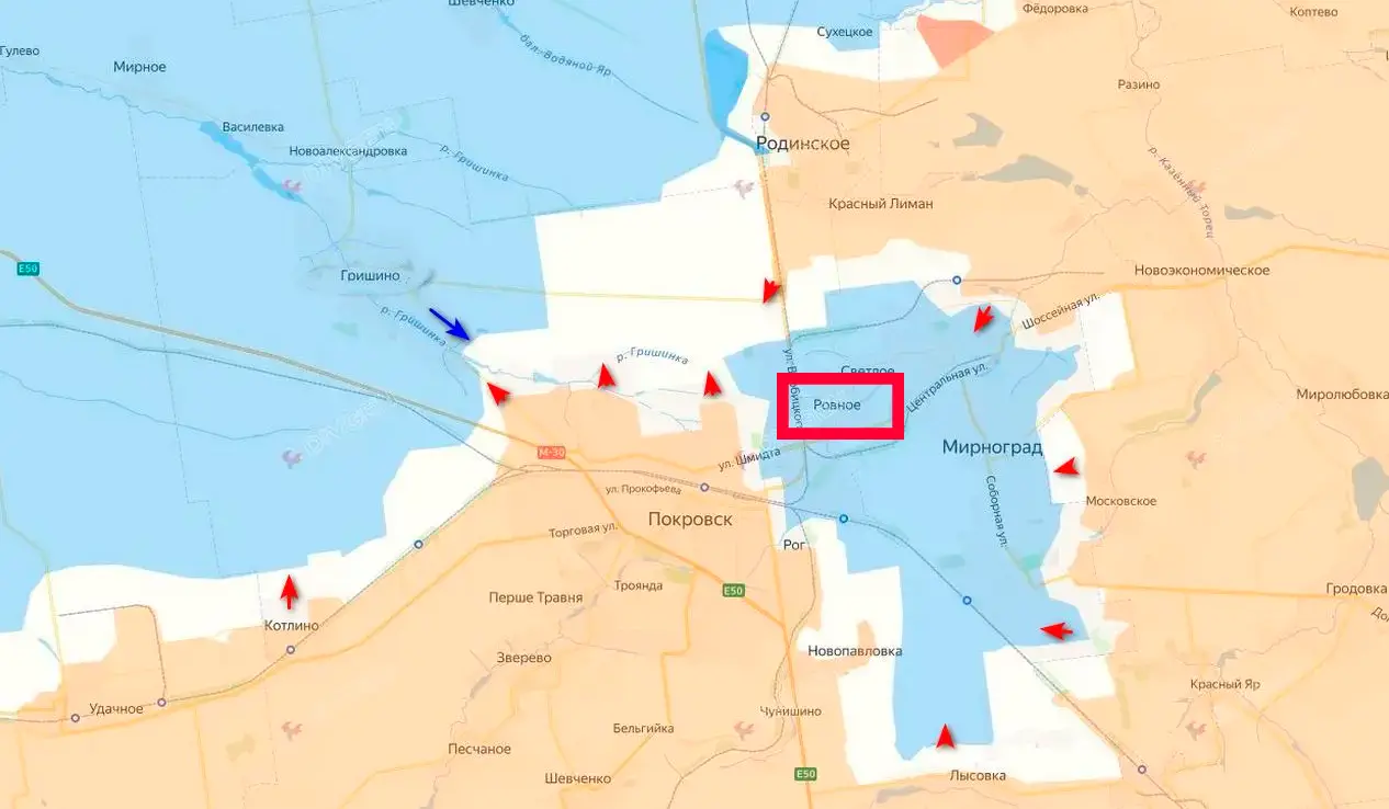 Российские войска зашли в Ровное – небольшое село рядом с Покровском, всего в полутора километрах от уже почти полностью окруженного ВС РФ Мирнограда.