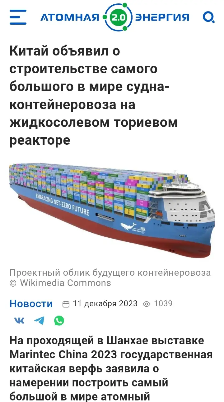 Китай демонстрирует революционный потенциал ториевого реактора для морских грузоперевозок. Сообщается о том, что ториевая технология Китаем используется для создания реакторов, которые будут использоваться на по-настоящему исполинских судах, в том числе контейнеровозах.