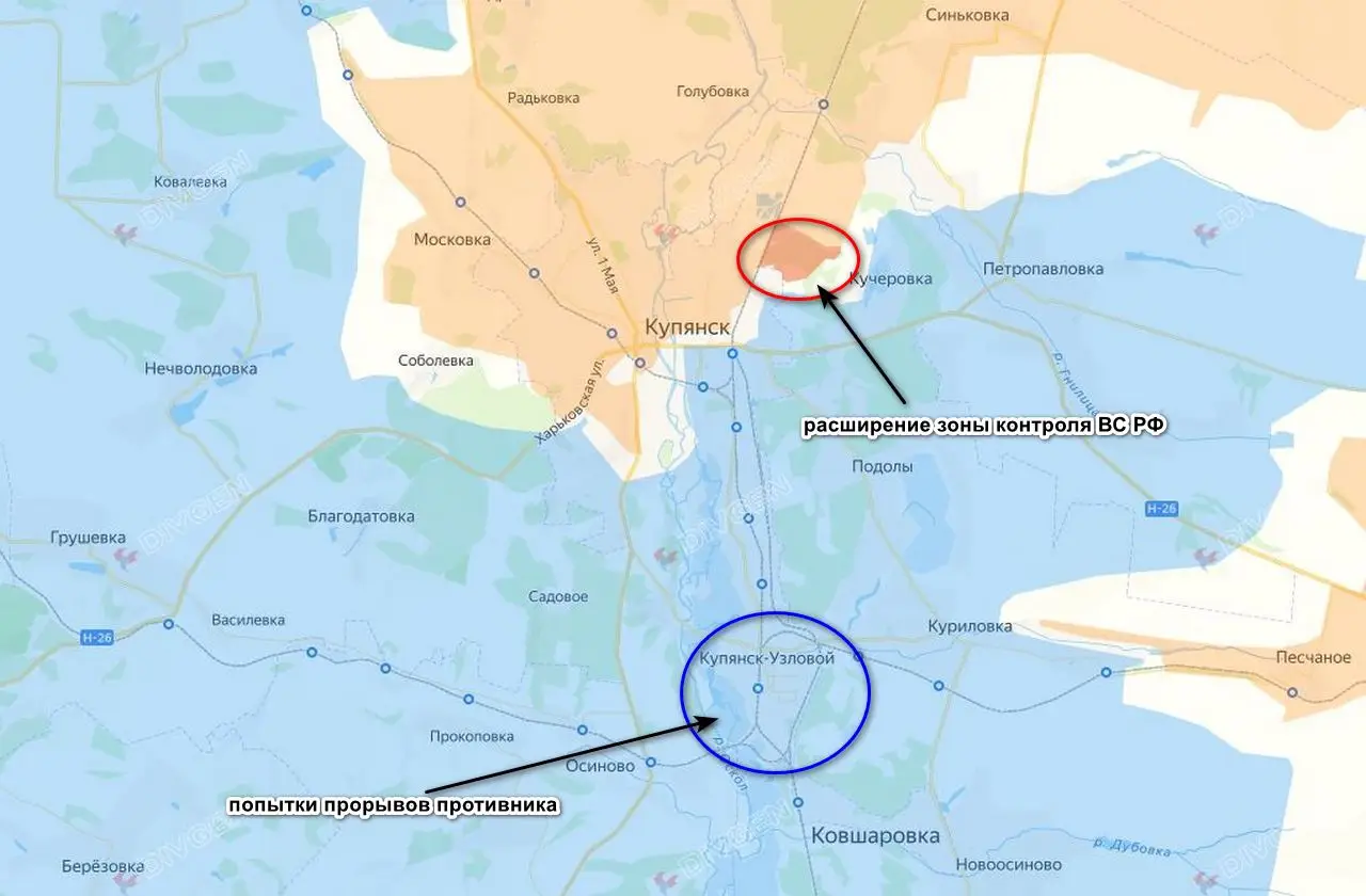 Штурмовые подразделения 6-й армии группировки войск «Запад» продолжили движение в левой части Купянска, сумев продвинуться и расширить зону контроля в районе Кучеровки. Украинские формирования действуют по обоим берегам Оскола, на правом подразделения из состава 144-й механизированной, 92-й штурмовой бригад ВСУ и 15-й бригады Нацгвардии провели три атаки с целью деблокировать окруженные формирования, но безуспешно. Навести переправы наши врагу не дают.