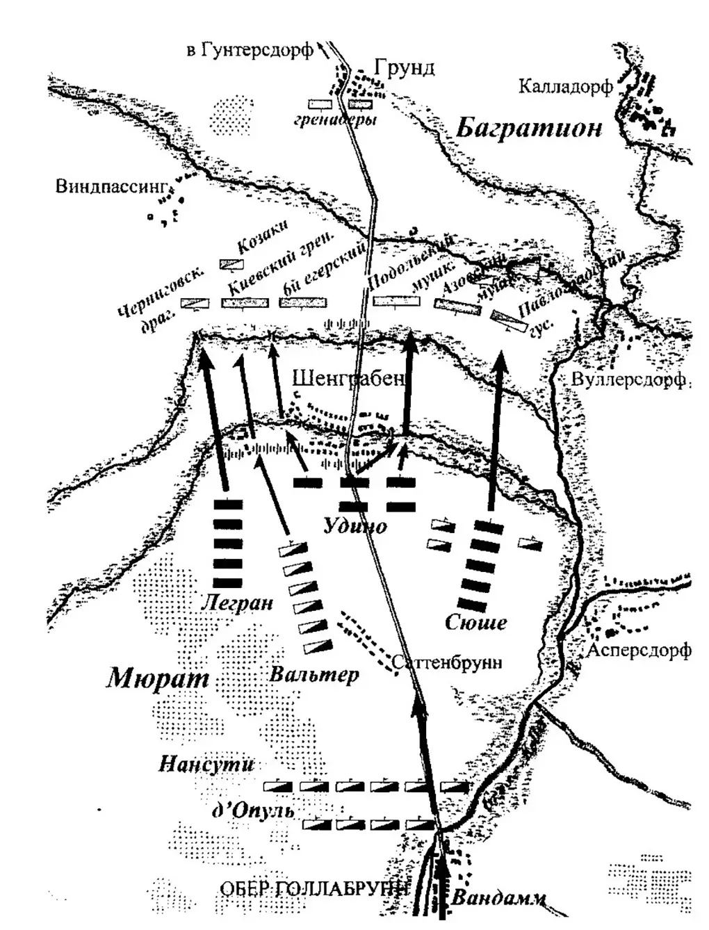 4 (16) ноября 1805 г. в 5 часов дня Мюрат получил выговор и приказ Наполеона атаковать русских. Начался бой. Гренадеры Удино и резервная кавалерия наступали в центре. Сульт должен был обойти правое крыло Багратиона, Ланн — левое крыло. Французы надеялись быстрым движением возместить время, потраченное на переговоры. Однако наши артиллеристы, отвечая на французский обстрел, зажгли Шёнграбен. Начался сильный пожар, ветер был в сторону французов. Огонь угрожал зажечь зарядные ящики, их пришлось вывозить.