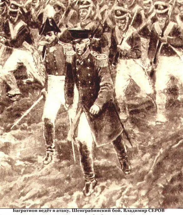 Князь Багратион спокойно переезжал от одного полка к другому и своим присутствием ободрял людей. Ничего говорить не надо было, всё было понятно. Смерть свирепствовала вокруг героя, но судьба его берегла.