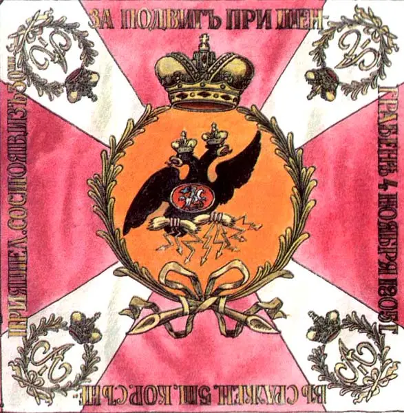 Георгиевское знамя Киевского гренадерского полка образца 1806 года. В 1806 году в Русской армии были введены наградные Георгиевские знамёна. В навершии знамени помещался Георгиевский крест, под навершием повязывалась чёрно-оранжевая Георгиевская лента со знамёнными кистями шириной в 1 вершок (4,44 см). Первые Георгиевские знамёна были выданы Киевскому гренадерскому, Черниговскому драгунскому, Павлоградскому гусарскому и двум донским казачьим полкам за отличие в кампании 1805 года с надписью: «За подвиги при Шёнграбене 4 ноября 1805 года в сражении 5-тысячного корпуса с неприятелем, состоящим из 30-ти тысяч»