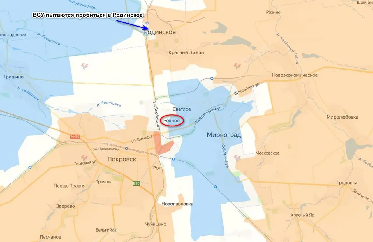 По имеющимся на данный момент сведениям, наши накануне не просто зачищали микрорайон Динас и взяли территории Покровского машиностроительного завода и бывшего молокозавода, но и с ходу вошли в Ровное. Бои за этот населенный пункт еще не закончены, но, судя по продвижению российских штурмовиков, сил у противника его удерживать уже нет.