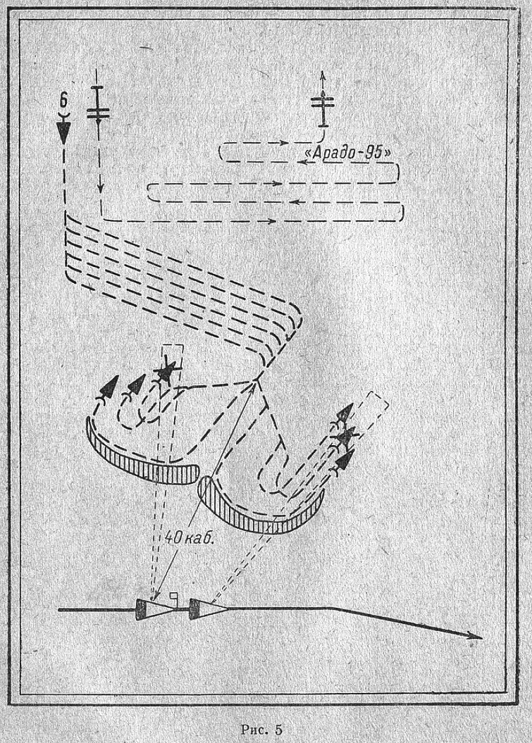 Кроме того, постановка дымовых завес производилась одновременно с двух торпедных катеров. Интересным является также изменение дистанций в строе кильватера. Переход совершался в строе кильватера на дистанциях, больше нормальных. При появлении же опасности строй смыкался (дистанция в этом случае меньше нормальной). Это, по всей вероятности, является узаконенным маневром во время перехода. Малые хода и глушители применялись, по-видимому, для уменьшения возможности обнаружения.