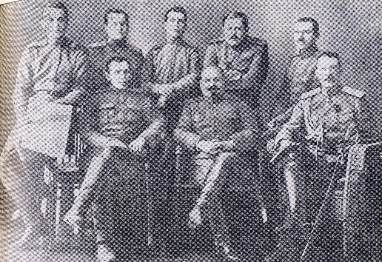 Но вернемся к «сибирскому красному генералу» Александру Таубе: он был участником Русско-японской и I мировой войн, после тяжёлого ранения в 1915 году занял пост начальника штаба Омского военного округа. На этой фотографии 1917 г. мы видим членов Омского военно-окружного комитета и высших офицеров военного округа. А. Таубе сидит справа: