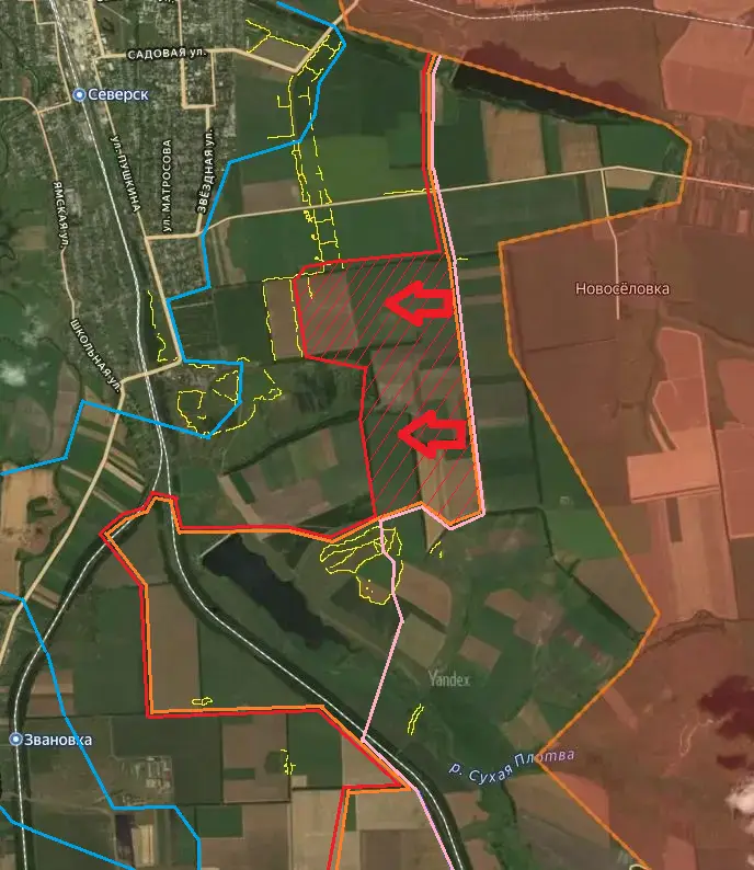 В ходе активных боевых действий нашим войскам удалось взять под контроль сектор леса западнее центральной части населенного пункта Ямполь, одновременно расширив зону контроля. Кроме того, ВС РФ продвинулись в лесном массиве между Ямполем и рекой Северский Донец, захватив несколько опорных пунктов и наблюдательных позиций противника. Есть продвижение в Дроновке и вдоль железной дороги к югу и юго-востоку от Северска.