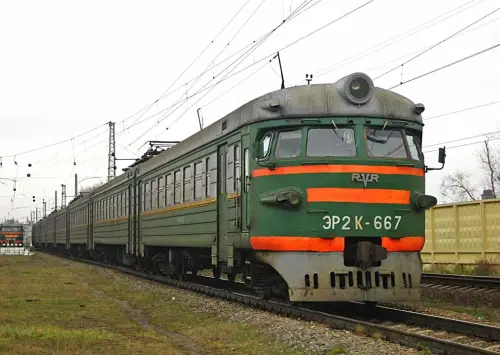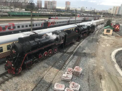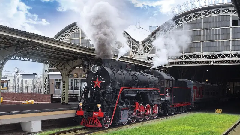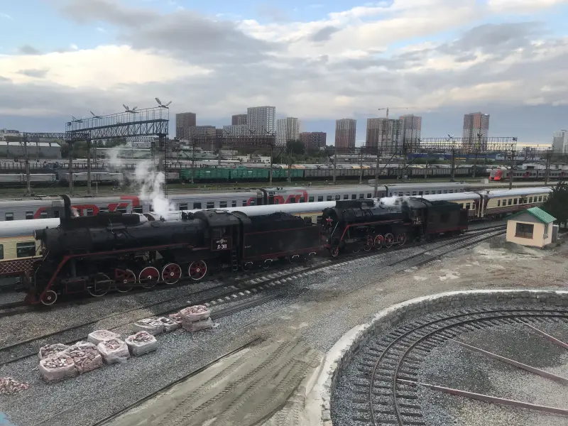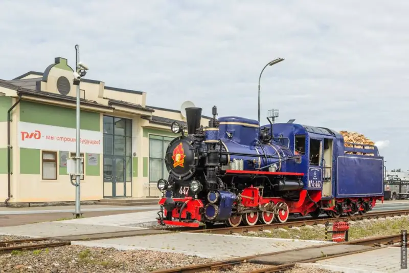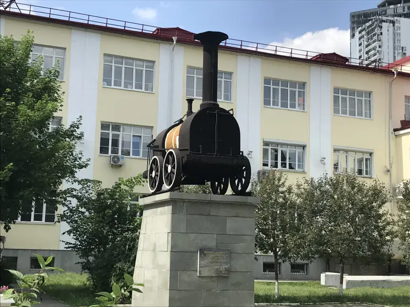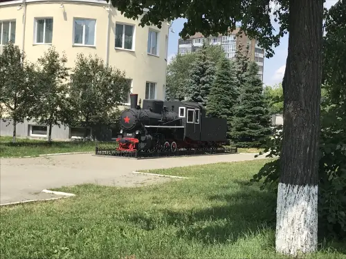 Забавный паровоз-памятник, стоящий перед железнодорожным вокзалом города Минеральные Воды. Фотография автора