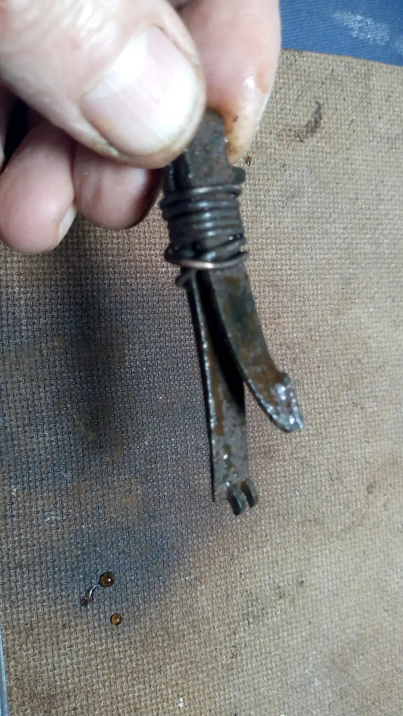 Пистолет на полувзводе. Хорошо видно, что в боевой пружине для свободного движения носка курка имеется прямоугольный вырез. При переделке в капсюльный у пистолета была явно отрезана задняя часть ствола и заменена новой, с брандтрубкой. Убрано огниво, подогнивная полка и пружина (на нашей схеме показаны голубым цветом, фиолетовым и чёрным)