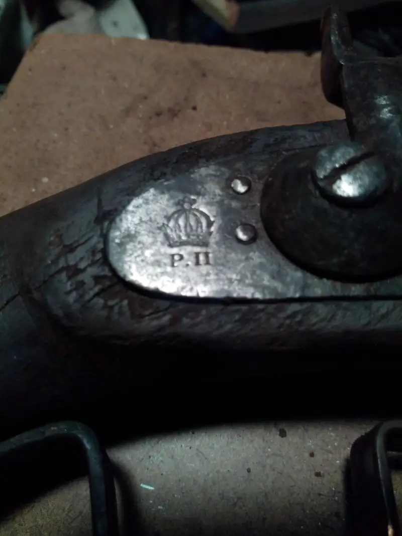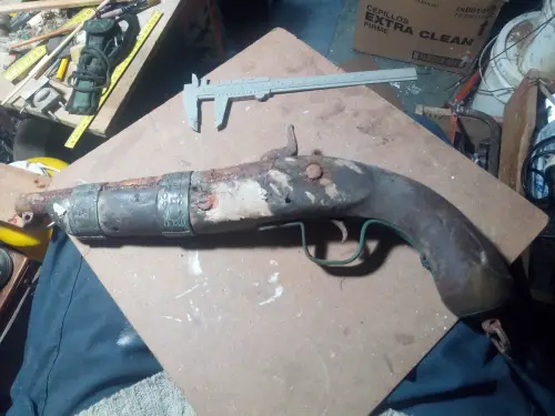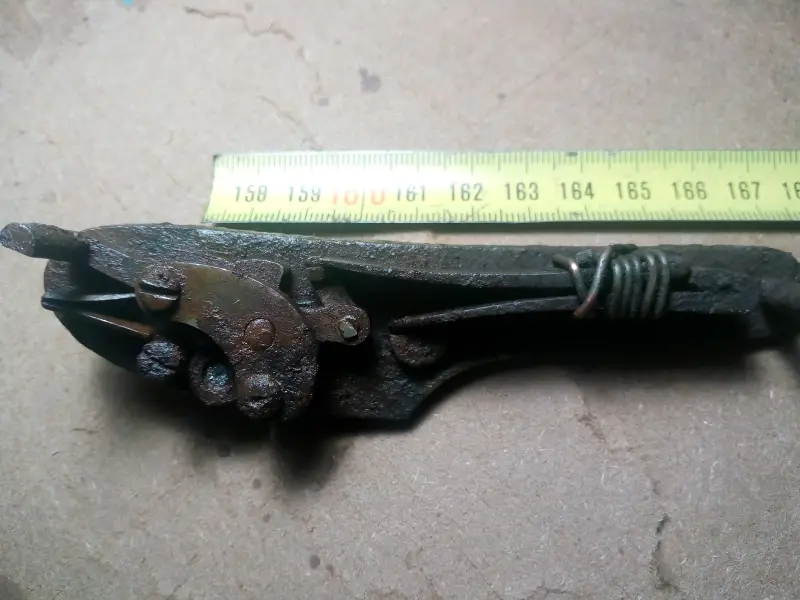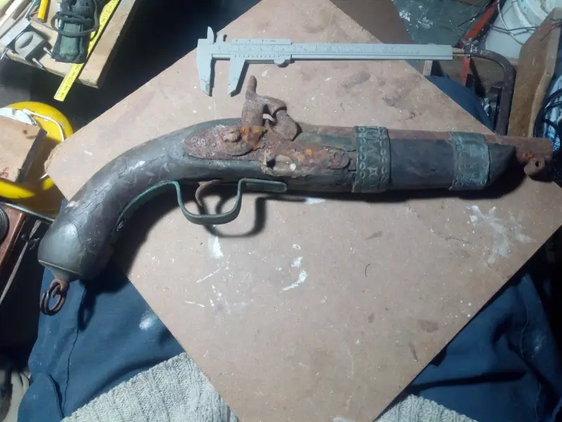 Вот он, этот пистолет, о котором пойдет речь. Он капсюльный, но вот замок у него от кремневого пистолета. Вес 1 кг. Калибр 15,7-мм. Фотография автора