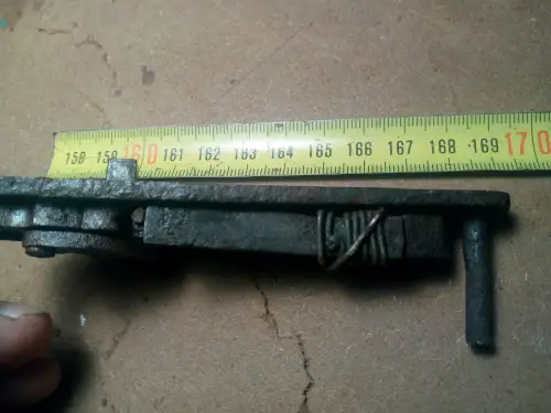 Скоба спускового крючка украшена гравировкой. Видна прямоугольная прорезь на боевой пружине для движения изогнутого носка курка
