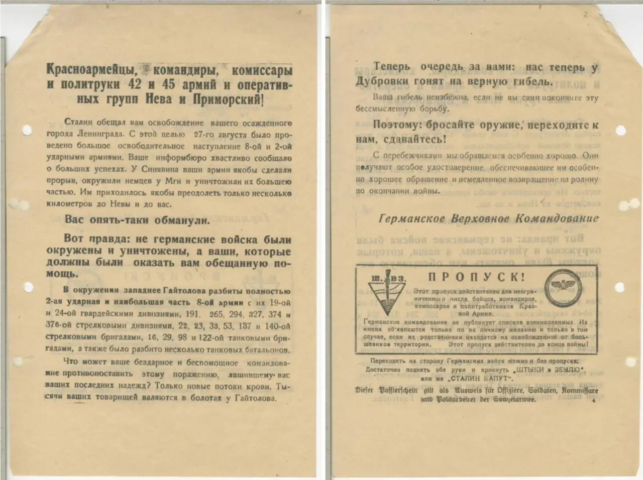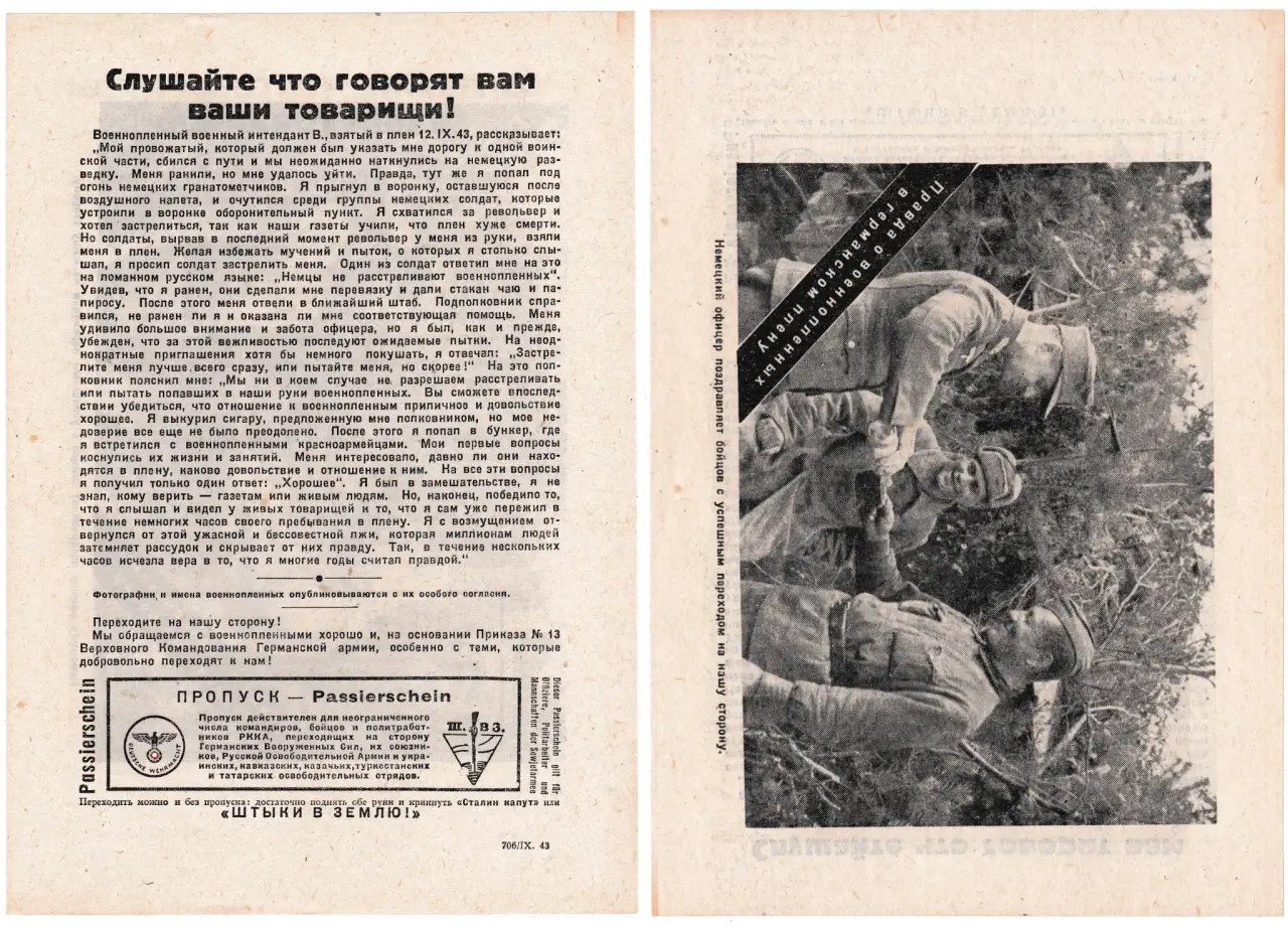 Одной из главных задач почти всех немецких листовок было побудить советских бойцов переходить в плен. На большинстве листовок было изображение пропуска с уточнением, что он действует для неограниченного числа солдат и офицеров (в начале войны по одному пропуску могли перейти до 50 человек). На пропусках была надпись, которую надо было выкрикнуть для обозначения своего намерения перехода к немцам («Штыки в землю!», «Сталин капут!» и другие).