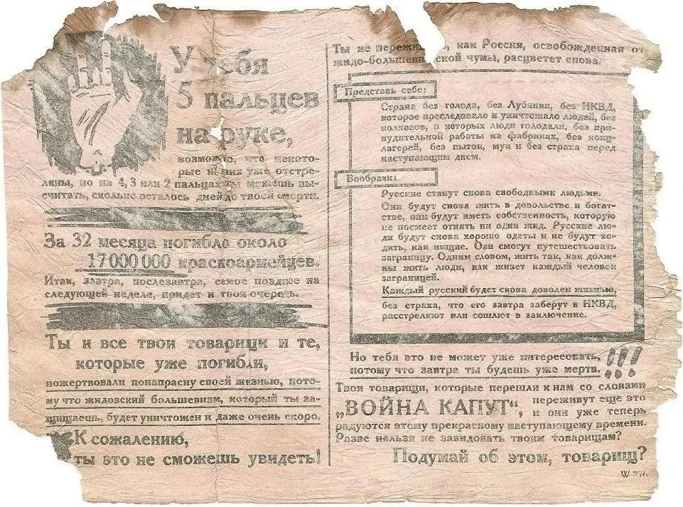 Также в листовках писалось, что капиталистические Англия и Америка на самом деле являются врагами СССР и не собираются помогать Красной Армии в борьбе с фашизмом. Помимо этого, часто указывалось, что руководство Советского Союза находится в сговоре с капиталистами и отдает им народные богатства народов СССР, а немецкая армия несёт освобождение и хочет положить этому конец.