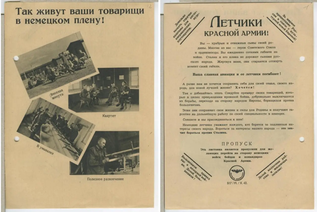 Фашисты понимали, что для того, чтобы советские солдаты начали сдаваться в плен, необходимо пообещать им то, в чём они в первую очередь нуждались. В первую очередь это уход от войны, вкусную еду и тёплое жильё. Для этих целей было создано огромное количество листовок, показывающих хорошую жизнь в немецком плену. На большинство подобных листовок помещались фотографии советских бойцов, якобы уже перешедших в плен. На фотографиях изображалось, как солдаты едят вкусную еду, работают по специальности, отдыхают, играют в карты, участвуют в праздничных мероприятиях в лагерях и прочее.
