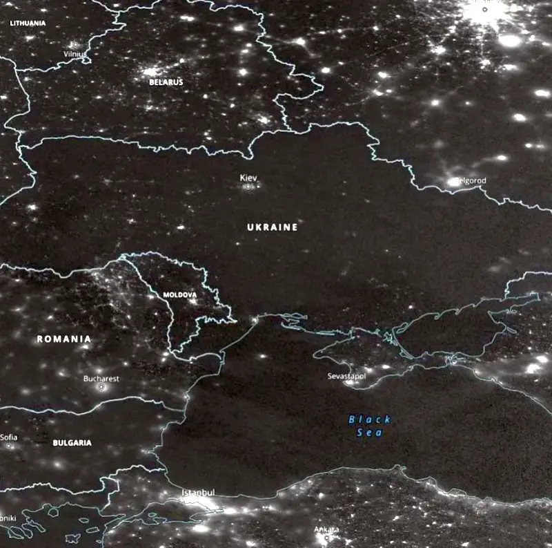 Достаточно посмотреть на спутниковый снимок в ночное время. На нем темное пятно Украины не сильно отличается от акватории Черного моря. Снимок публикуют сами украинцы, наверняка сравнивая малозаметную точку Киева с огнями городов Крыма, Белгородом и уж тем более с огромным «московским солнцем» в правом верхнем углу.