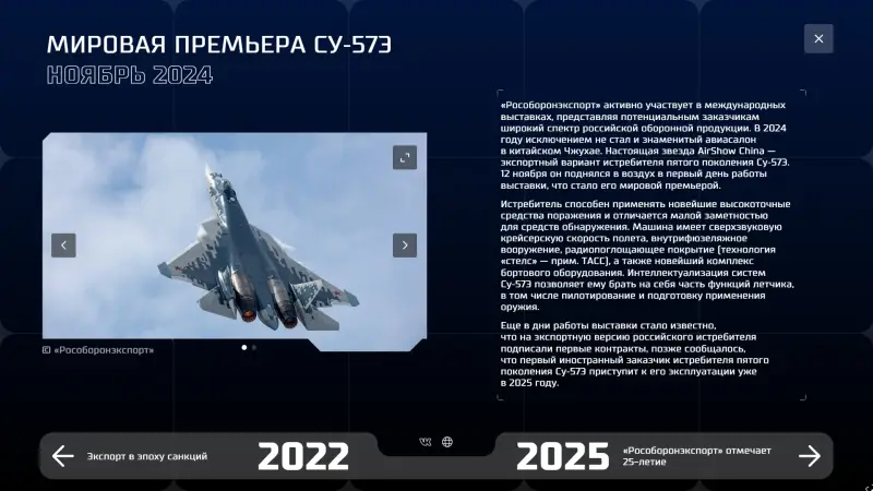 Вся наша продукция прошла длительную апробацию в боевых условиях, постоянно совершенствуется с учетом полученного опыта — в этом ее главное преимущество перед конкурентами, у которых такого опыта нет. Прежде всего, это истребитель Су-57Э — единственная на сегодня в мире машина 5-го поколения, которая в настоящих и длительных боях доказала возможность эффективно действовать против самого серьезного противника, имеющего продвинутые системы ПВО и РЭБ.
