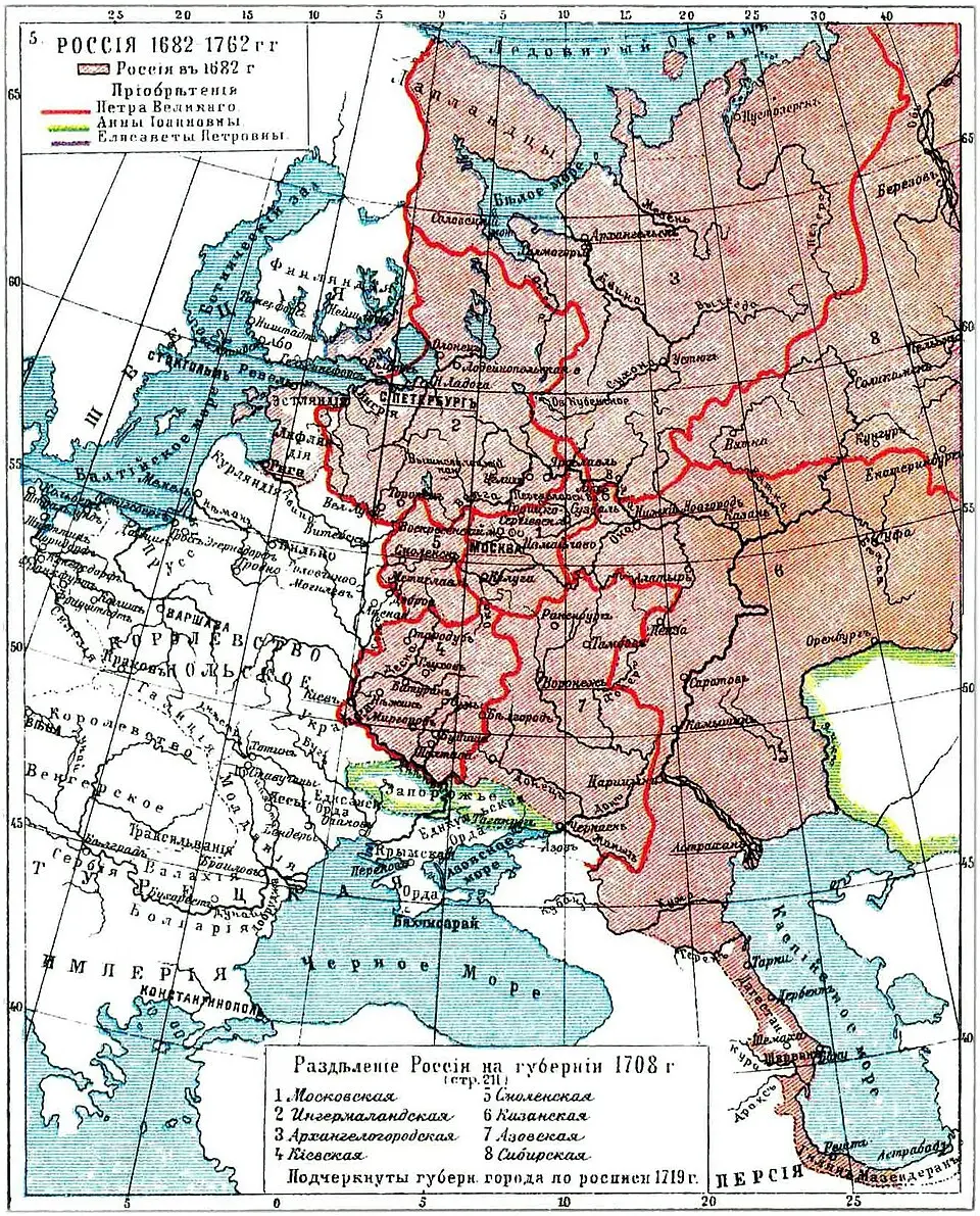 Указ от 18 (29) декабря 1708 г. извещал о намерении «для всеобщей пользы учинить 8 губерний и к ним расписать города». Первоначально были созданы Московская, Ингерманландская (позднее Санкт-Петербургская), Смоленская, Киевская, Азовская, Архангелогородская и Сибирская губернии. В 1714 г. из Казанской выделили Нижегородскую и Астраханскую губернии, а в 1713 г. возникла Рижская губерния.