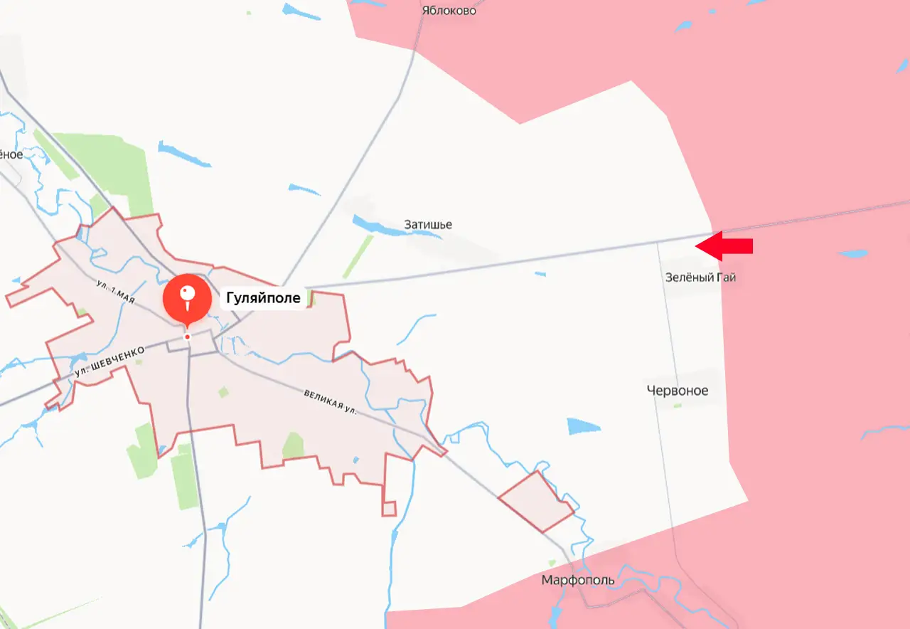 В результате успешных наступательных действий российские штурмовые группы вплотную подошли к населённому пункту Зелёный Гай. Он расположен в 5 км от Гуляйполя.