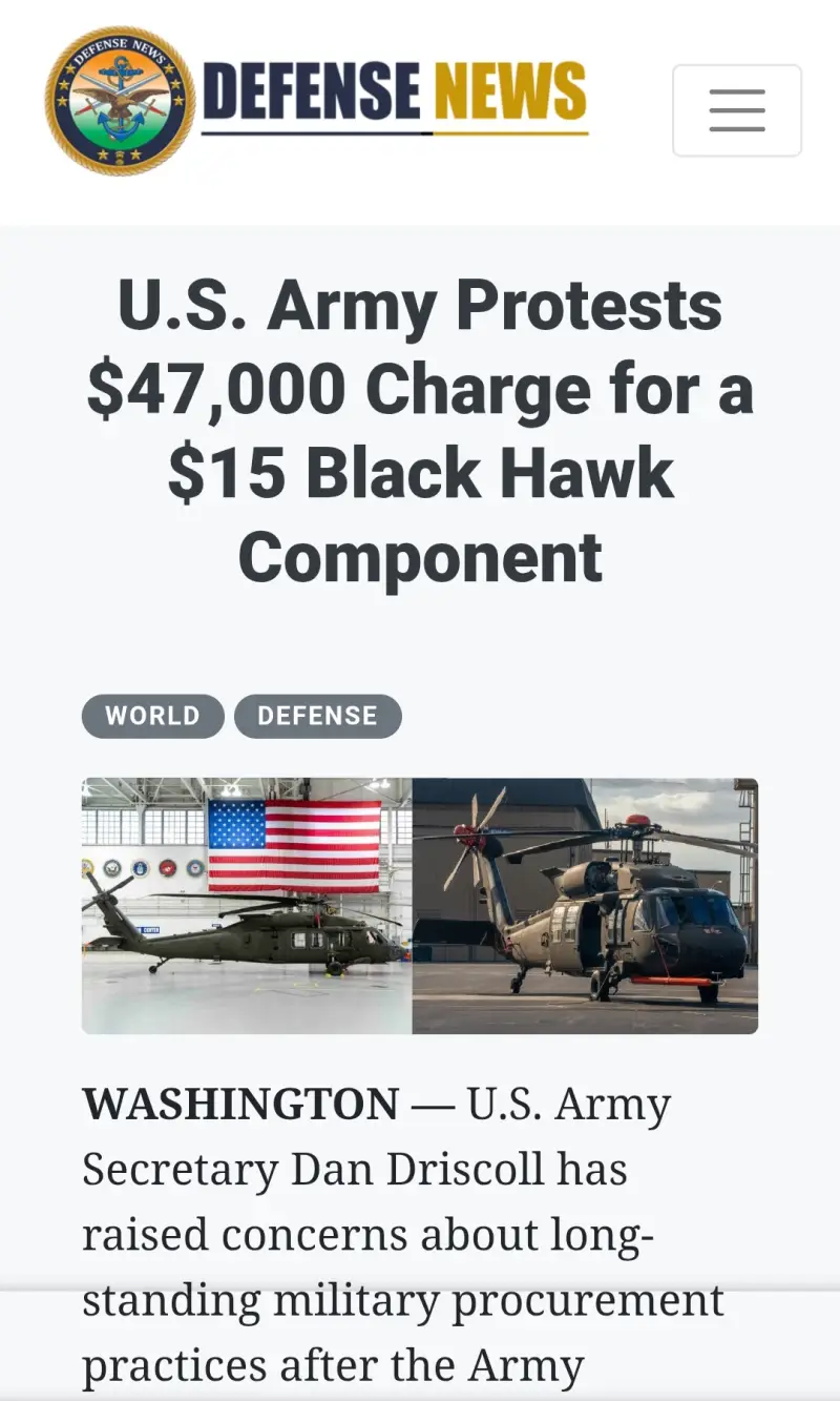 Среди других неадекватных технических решений называются обычные пыле- и влагозащитные заглушки для ВТС C-17 Globemaster III, цена которых в 55 раз превысила гражданские аналоги. Кнопка управления экраном для вертолёта Black Hawk обошлась в $47 тыс., хотя имелись однотипные устройства всего за $15.