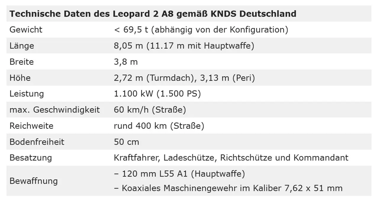 Бундесвер заказал в общей сложности 123 единицы A8, которые планируется передать в период с 2027 по 2030 год. До начала поставок данная модель будет проходить комплексную проверку. 45-я танковая бригада, которую предполагается развернуть в Литве, станет первым подразделением немецкой армии, которое получит самую современную версию ОБТ.