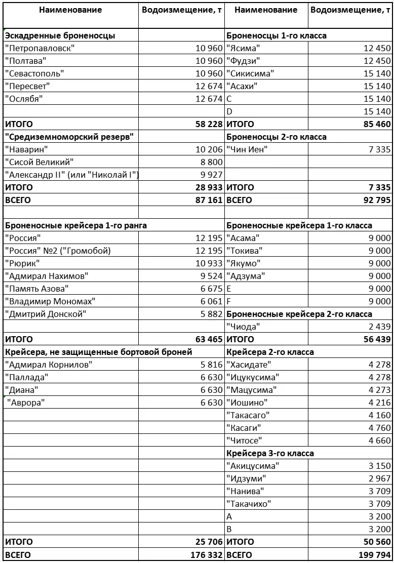 Дабы не усложнять сущности сверх необходимого, я не стал давать в таблице данные по нашим канонерским лодкам (6 ед.) и по японским крейсерам 4-го класса (5 ед.). Все-таки по большому счету их наличие, пускай и важное само по себе, на общее соотношение сил флотов влияло мало.
