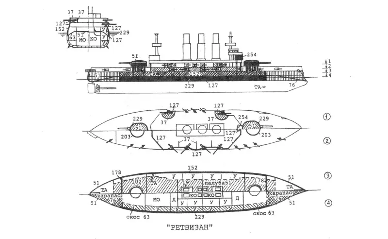3. Унификация флотских и сухопутных крупнокалиберных артсистем, приведших к появлению 10-дм/45 пушки обр. 1891 г. Безусловно, вооружение такими артсистемами эскадренных броненосцев – в высшей степени сомнительное решение. Но, коли оно было принято, за счет известного облегчения как самих орудий, так и их башенных установок в сравнении с 12-дм, появилась возможность строить высокобортные боевые корабли, что давало плюс к мореходности. Последнее отвечало требованию, при необходимости, совершить переход на Дальний Восток и располагало к использованию броненосцев в крейсерских операциях.