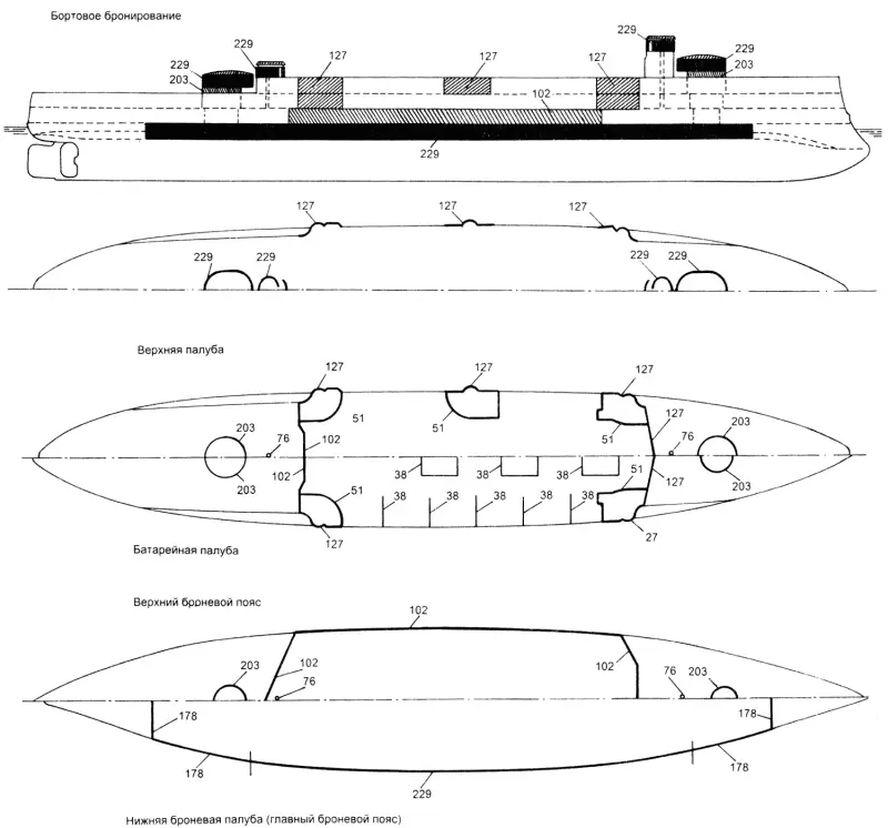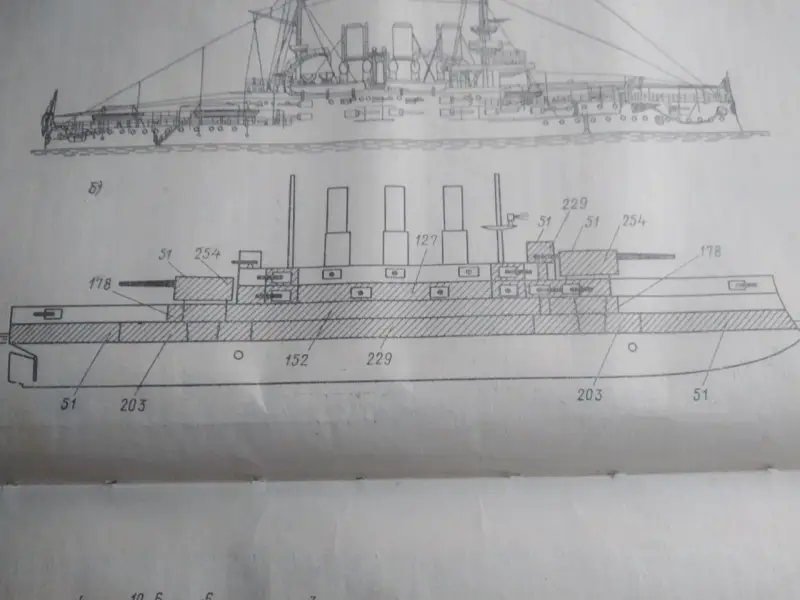 4. Появление цементированной брони. Данное новшество позволило создавать более тонкие, а значит – и более легкие бронеплиты в сравнении с нецементированной броней, при равной их стойкости. А это, в свою очередь, позволяло либо увеличить площадь бронирования борта либо облегчить вес брони в пользу угольных запасов, что позволяло увеличить дальность хода корабля. На этапе проектирования «Пересветов» удалось не только обеспечить им весьма мощную «эскадренноброненосную» защиту английского типа, но и довести полный запас угля до 2058 т против 1050 т у броненосцев типа «Полтава». При этом ожидалось (увы, ошибочно), что применение трехвальной энергетической установки позволит увеличить дальность экономическим ходом в режиме работы одной машины из трех (средней). Все это, опять же в теории, позволило спроектировать броненосцы с увеличенной дальностью хода, пригодные к использованию в крейсерских операциях.
