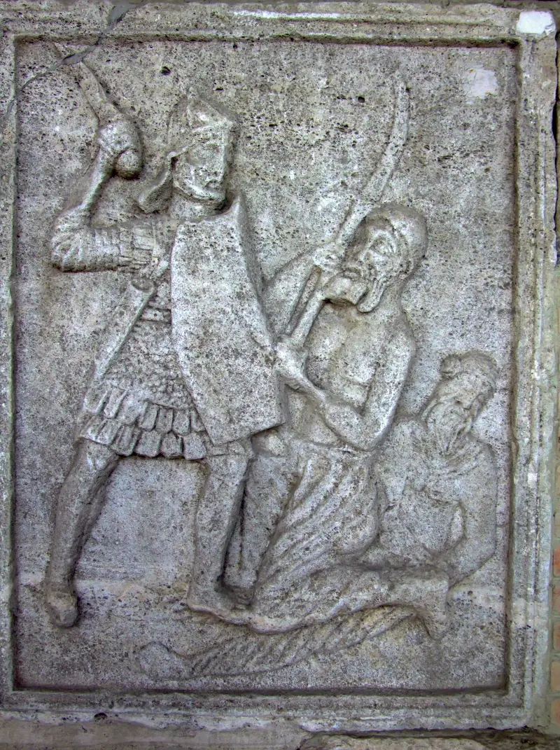 Не менее совершенным было вооружение и тех самых гуннов, отступая перед которыми, готы начали свою войну с Римом. Шлемы у них были из железных полос, склепанных между собой, нередко увенчанные плюмажем либо фигурой фантастического животного. Кольчугу гунны знали и использовали, но кроме нее носили также длинные ламеллярные (т. е. пластинчатые), словно из рыбьей чешуи, панцири из связанных между собой металлических пластинок — нередко с такой же чешуйчатой пелериной, к которой прикреплялись оплечья из металлических полос. Руки гуннских воинов были защищены наручами. И хотя потом римлянам все-таки удалось разгромить гуннов в 451 году в битве на Каталаунских полях (неподалеку от города Шалона во Франции), мнение о полном превосходстве конницы над пехотой стало всецело подавляющим в умах современников.