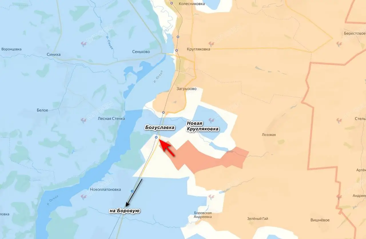 Активные боевые действия начались на Боровском участке фронта, штурмовые подразделения группировки «Запад» после длительного затишья сделали рывок и продвинулись до 4 км в сторону реки Оскол. Одновременно наши штурмовики зашли в Богуславку, сумевши закрепиться на южных окраинах населенного пункта. На данный момент наши расширяют зону контроля в селе, занимая жилую застройку.
