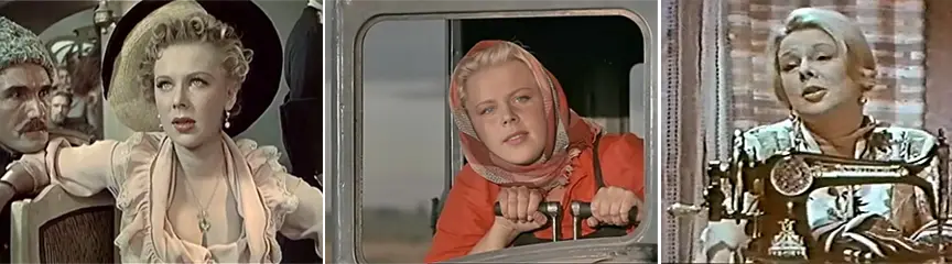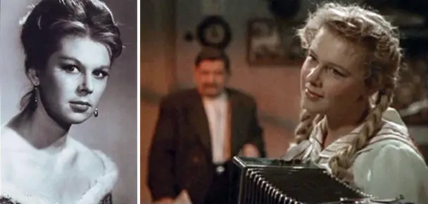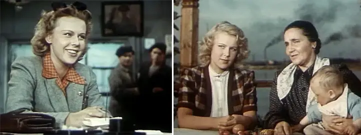 На фото справа: Лариса Кронберг в роли Гали в художественном фильме об авиационном училище морских летчиков «Звезды на крыльях» (1955)