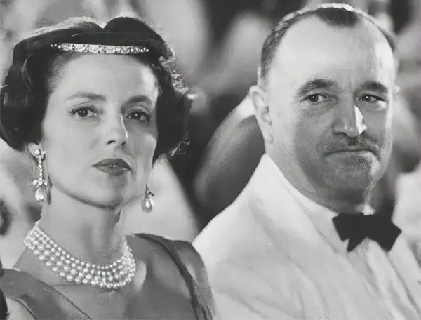 Морис Дежан с супругой Мари-Клер Дежан на показе коллекции Dior в Москве в Доме культуры «Крылья Советов» под руководством Ива Сен-Лорана, 1959 год. Серия снимков для журнала Life называлась «Модели Dior гуляют по консервативной Москве 1959 года»