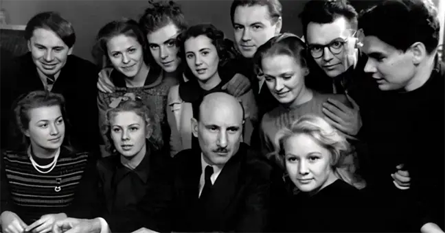 Лариса Кронберг (в нижнем ряду вторая слева, по правую руку от С. А. Герасимова) на курсе ВГИКа. По левую руку - Ия Арепина. На фото также - Л. Гайдай и Н. Гребешкова и другие студенты. 1953 год