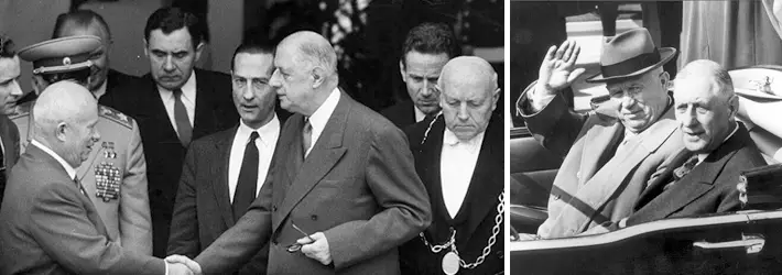 В марте-апреле 1960 года Н. С. Хрущев совершил официальный визит во Францию, где принимал президент Шарль де Голль. Поездка включала, кроме официальных церемоний в Париже, посещение французских провинций и промышленных объектов, в частности, таких как завод Renault, а также личные переговоры двух лидеров, на которых обсуждались важные вопросы отношений между Востоком и Западом. Целью визита было оценить взаимные силы и улучшить отношения. А вот уже после отъезда Хрущева в Бордо некий кардинал Поль Решо призвал к непрерывным антикоммунистическим мессам во всех церквях, ибо Хрущев считался гонителем церкви во всей Восточной Европе...