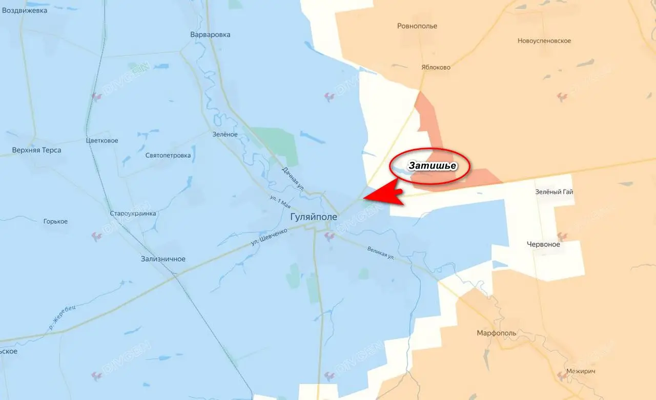 По данным канала, штурмовики 114-го мотострелкового полка 127-й дивизии 5-й армии группировки «Восток» взяли под контроль населенный пункт Затишье, выйдя практически на окраины Гуляйполя. Это было последнее село перед районным центром, очень хорошо укрепленное. Но это противнику не помогло. Как и контратаки ВСУ в попытках выбить наших из Затишья.