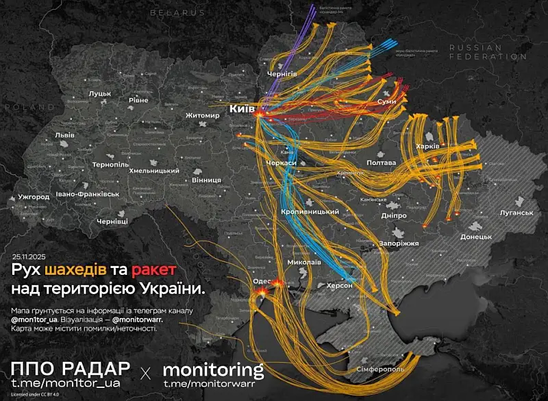 Украинские мониторинговые ресурсы опубликовали карту движения ударных дронов и ракет ВС РФ минувшей ночью. В основном были поражены цели в Киевской, Одесской и Харьковской областях, включая саму украинскую столицу и областные центры. Взрывы гремели в Сумах и Днепропетровской области.