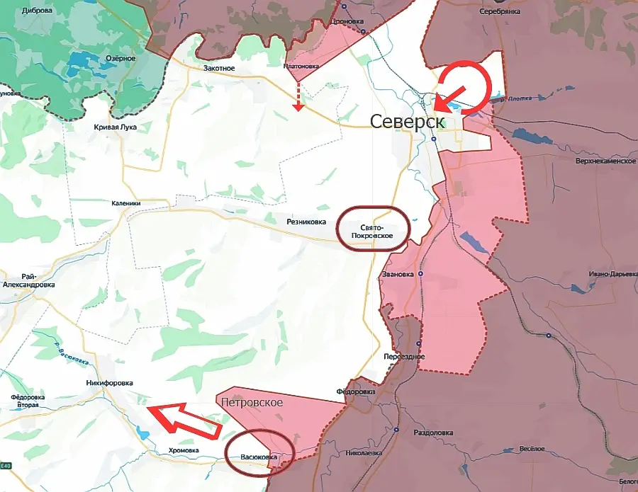Это село на Северском направлении довольно длительное время находилось в так называемой серой зоне. Наши заняли и закрепились на его восточных окраинах, противник держал под контролем западную часть населенного пункта. Однако после того, как ВС РФ несколько дне назад освободили Петровское (с 2016 года было Пазено) к северо-западу от Васюковки, полное занятие и этого села нашей армией стало лишь вопросом времени.