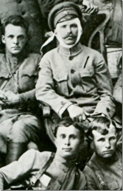 Д. А. Фурманов (эсер-максималист, далее – анархист, член РКП (б) с 1918 г.) рядом с раненым Чапаевым, фотография сделана в июле 1919 г. Слева полулежит Петр Исаев