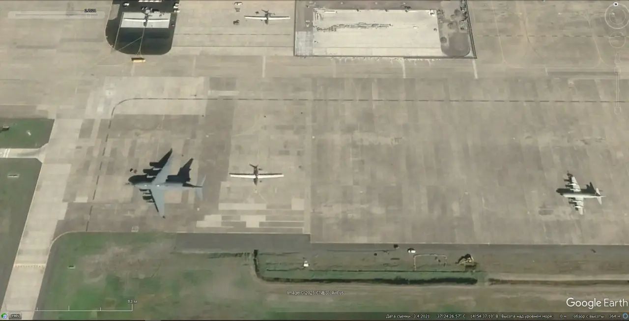 Спутниковый снимок Google Earth: разведывательный Boeing RC-135S Cobra Ball, самолёт ДРЛО Boeing E-3G Sentry и заправщик Boeing KC-135R на авиабазе Кадена