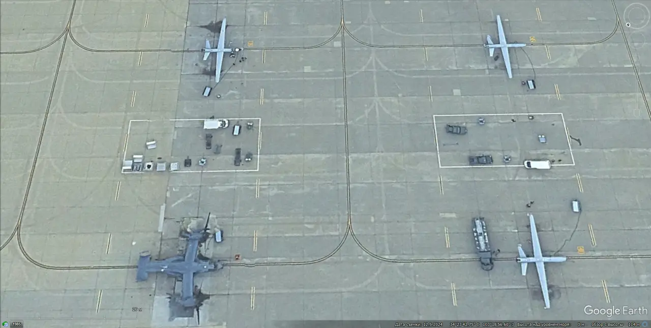 Спутниковый снимок Google Earth: самолёты Pilatus U-28A Draco и конвертопланы Bell Boeing CV-22 Osprey на авиабазе Кэннон. Снимок сделан в мае 2023 года